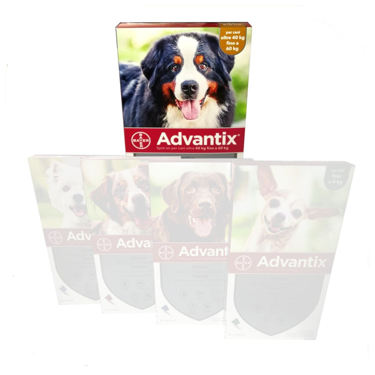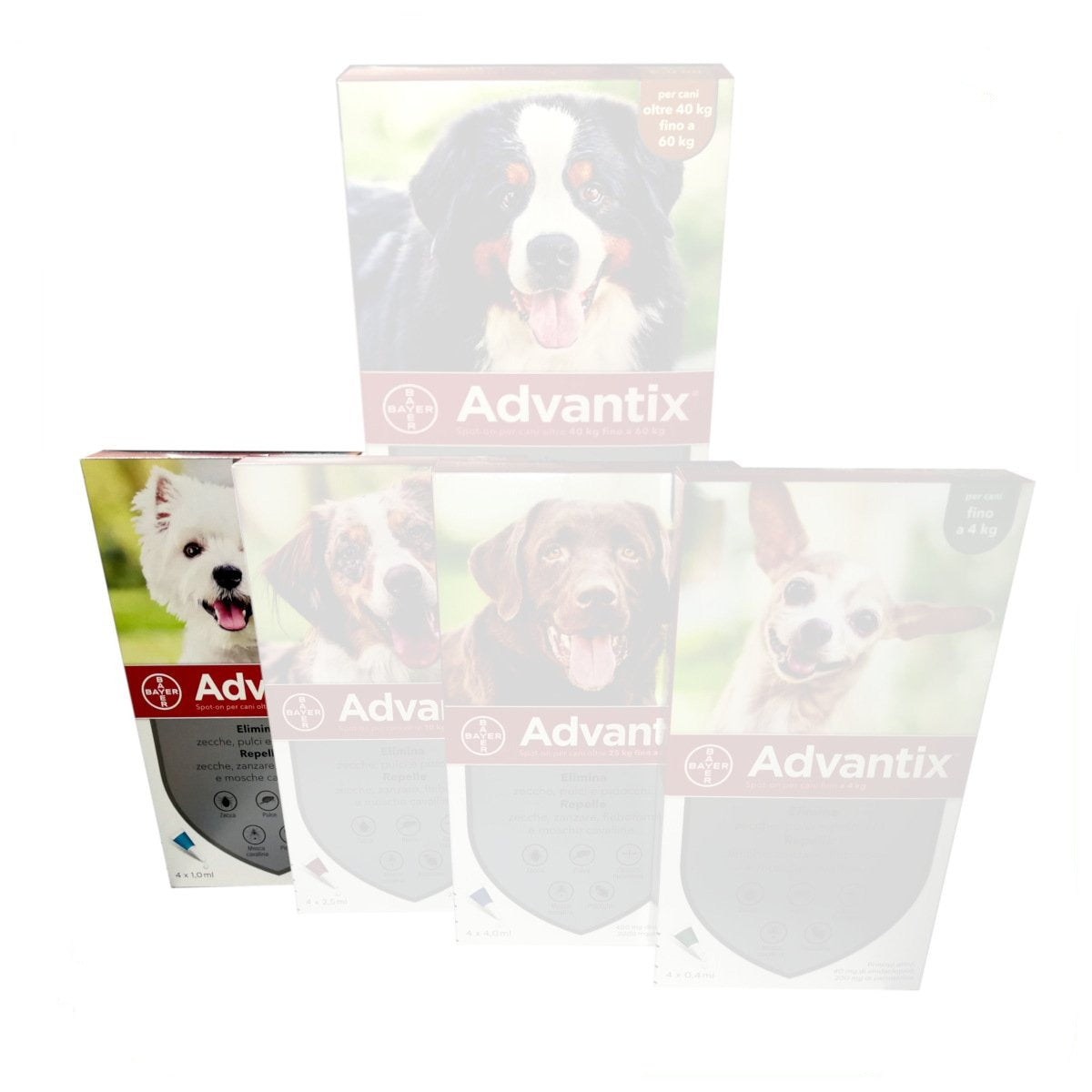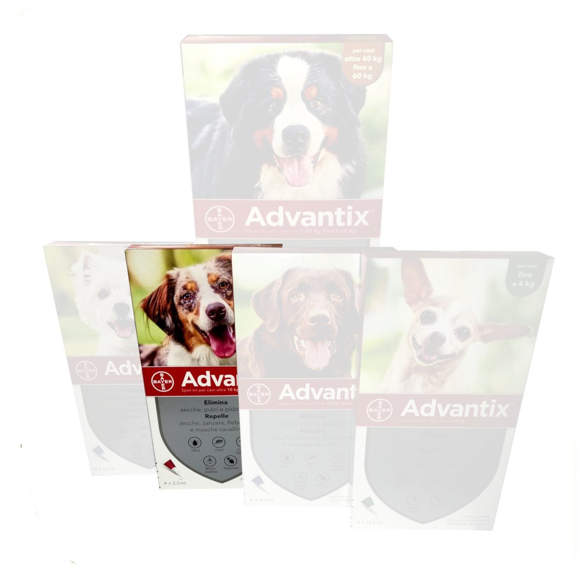 Antiparassitario spot-on Advan-tix contro pulci, zecche, zanzare e pappataci, 5 prodotti adatti alle varie taglie del cane in base al peso del tuo pet. Nota: il prodotto può essere spedito solo in Italia!