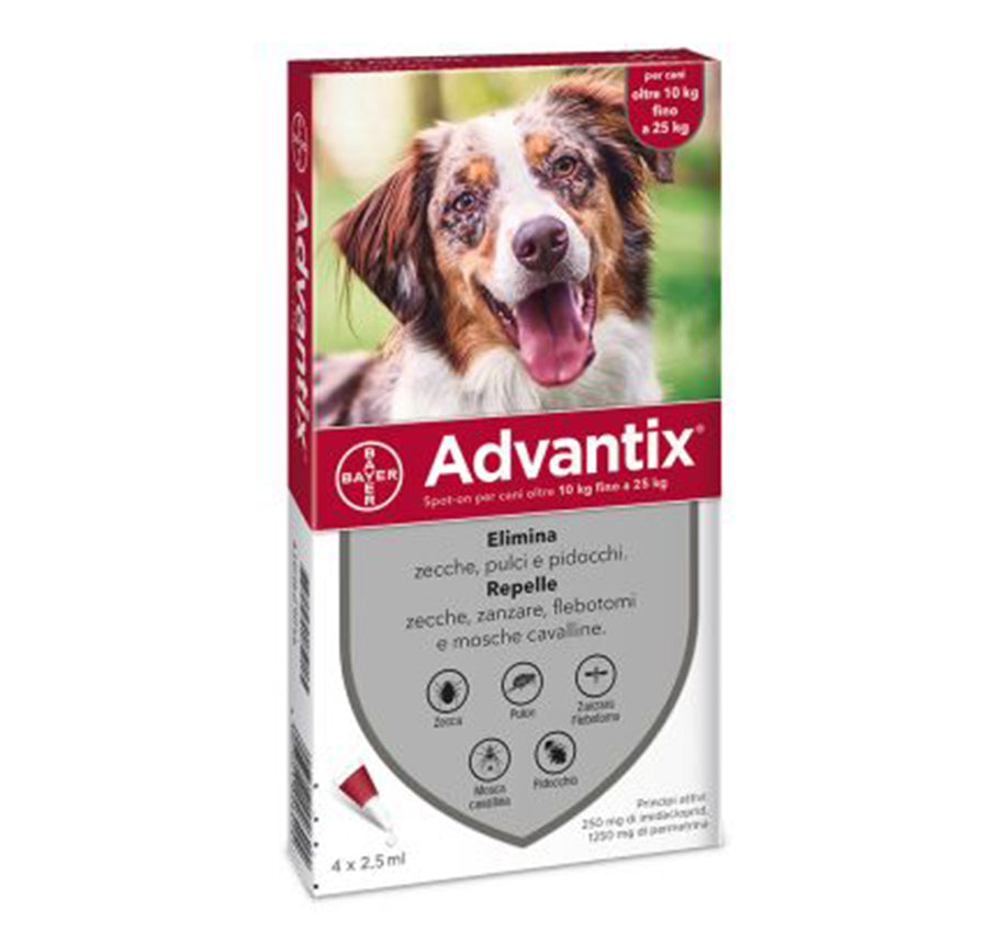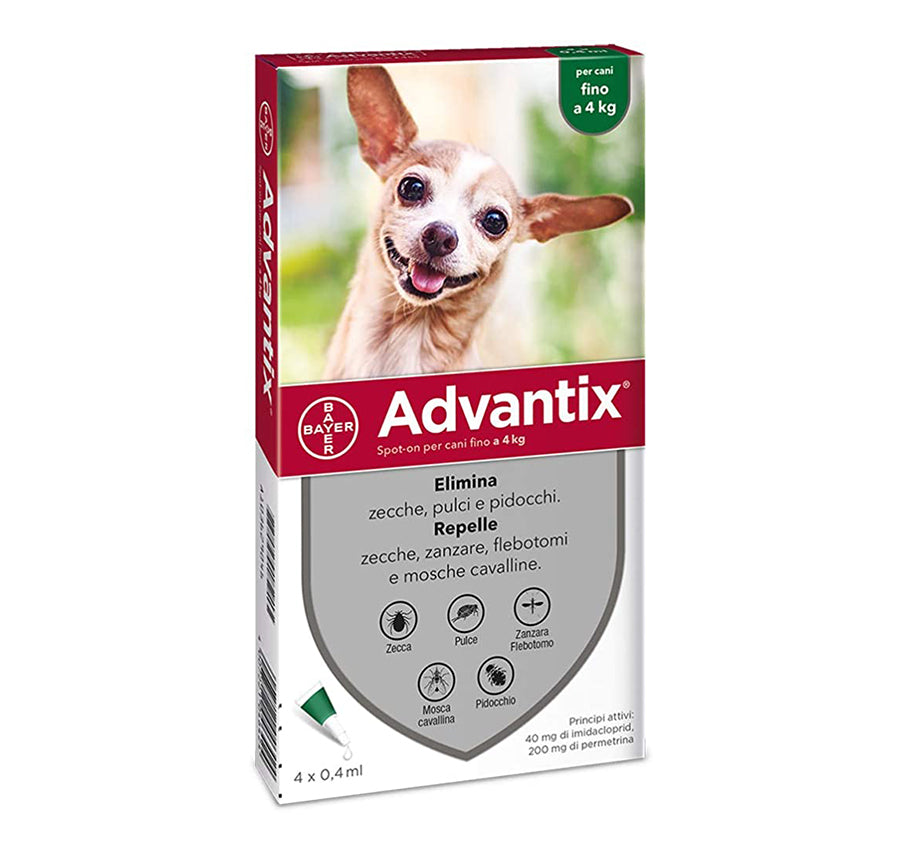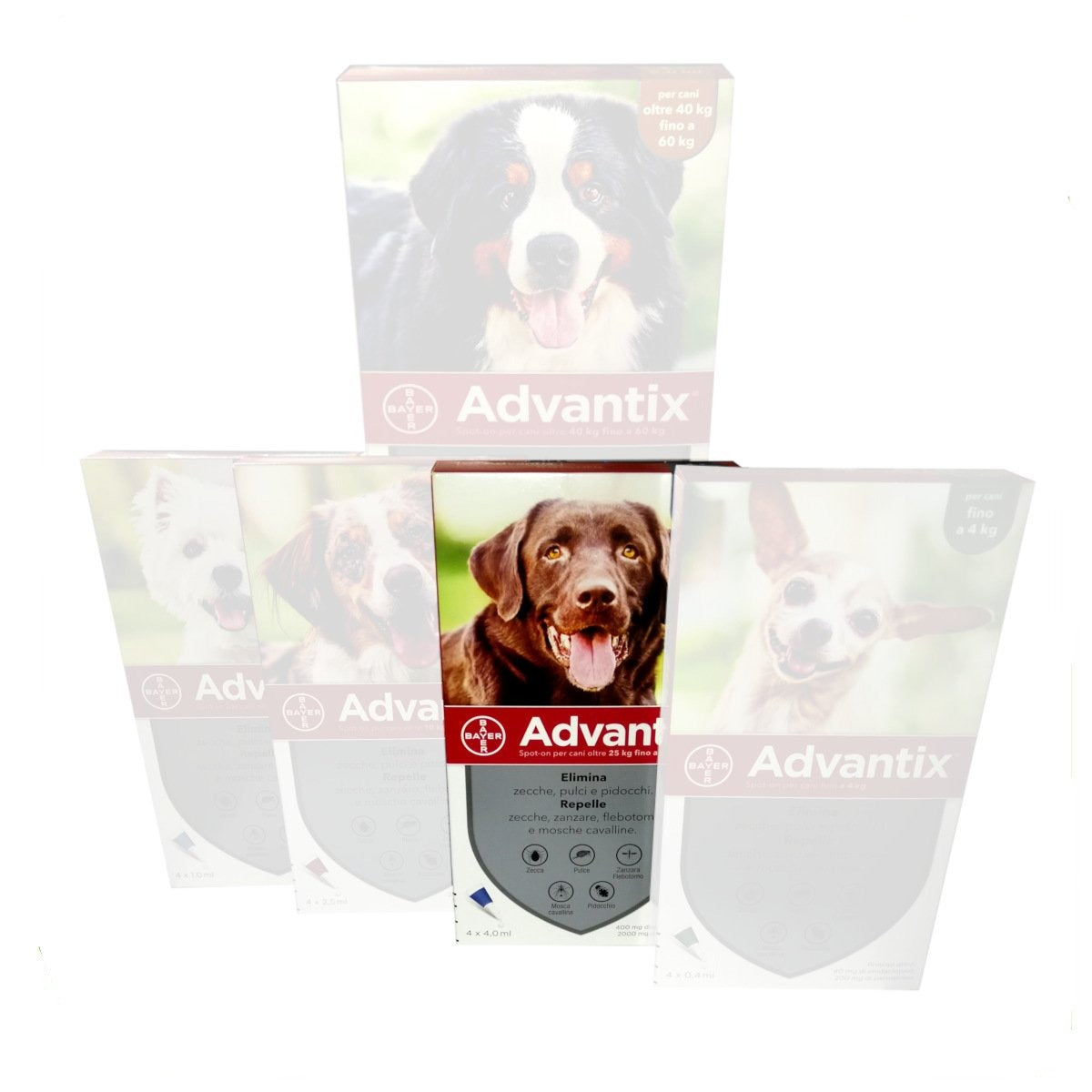 Antiparassitario spot-on Advan-tix contro pulci, zecche, zanzare e pappataci, 5 prodotti adatti alle varie taglie del cane in base al peso del tuo pet. Nota: il prodotto può essere spedito solo in Italia!