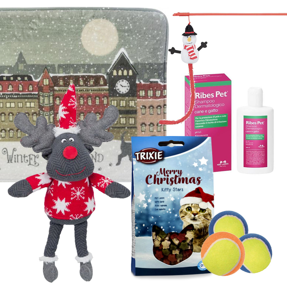 Composizione natalizia per gatti con: 1 renna natalizia da 42cm, 1 pallina da tennis (TRIXIE), 1 cannetta con pupazzo di neve da 31cm e 1 Snack Trixie, 1 Tappetino natalizio 40cm x 30 cm e 1 Shampoo Dermatologico Ribes Pet