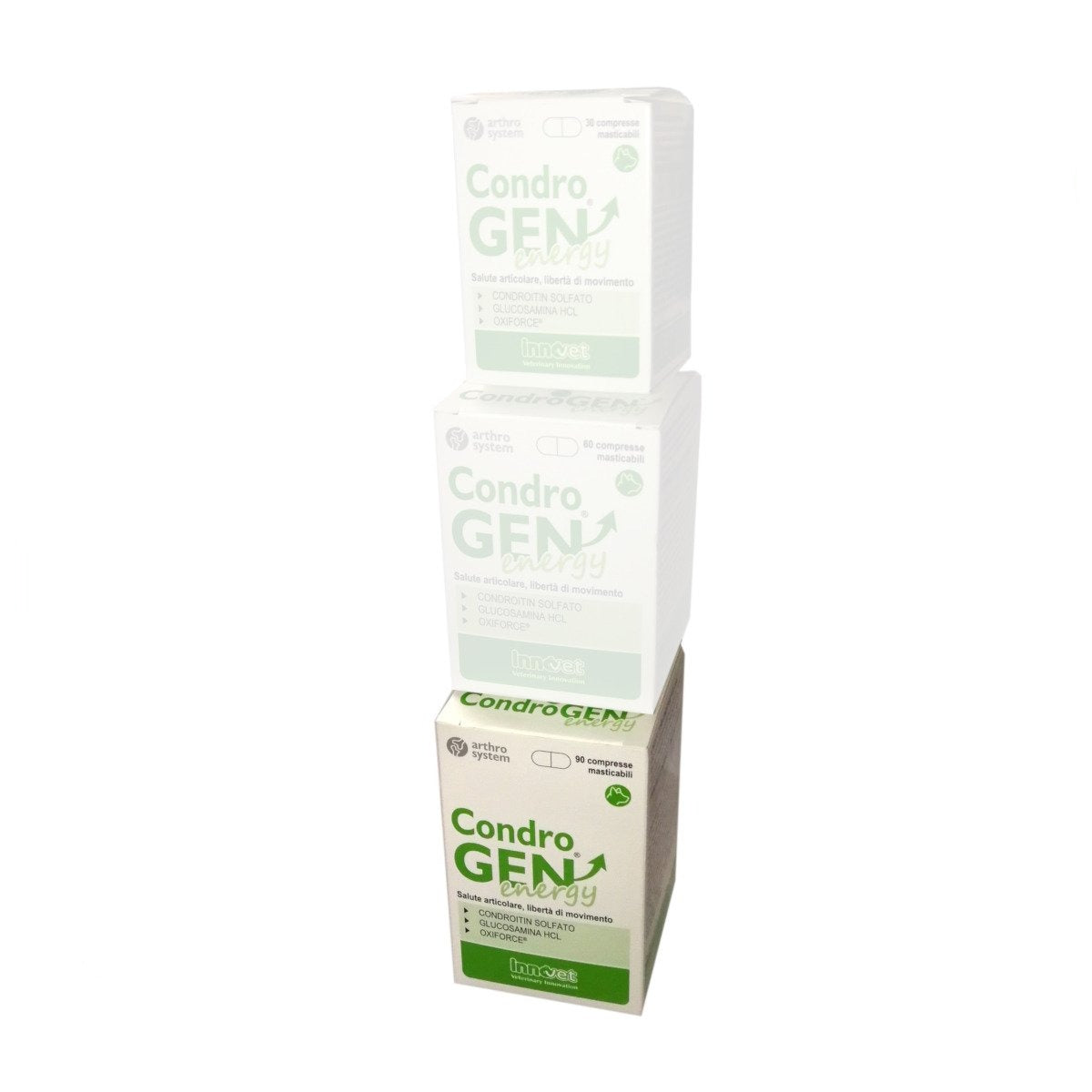 Condrogen Energy è indicato per la salute delle articolazioni di: -cuccioli di razze grandi/giganti per un corretto sviluppo articolare; -cani sportivi (es. agility, disc-dog, canicross, coursing); -adulti sottoposti ad intenso carico ed usura articolare (es. cani da soccorso, cani in sovrappeso). Il prodotto non è un farmaco veterinario, ma un alimento complementare per cani. Proprietà -Condroitin solfato e glucosamina: concorrono in modo sinergico a nutrire la cartilagine articolare. Entrambe le sostanze, normali costituenti della matrice cartilaginea, aiutano a mantenere il corretto metabolismo dei condrociti (le cellule della cartilagine). -Oxiforce: esclusiva associazione di SOD (superossido dismutasi) e nucleotidi, ottimizza la funzione dei tessuti molli di contenimento (muscoli, tendini e legamenti), migliorando la stabilità delle articolazioni. -SOD: enzima naturale antiossidante che neutralizza i radicali liberi prodotti durante l'intensa attività fisica. I nucleotidi aiutano la performance muscolare ed il recupero dopo esercizio fisico prolungato. Ingredienti Glucosamina da fermentazione (28,5%), solfato di condroitina (14,2%), lieviti ottenuti da Saccharomyces cerevisiae (10,7%), mono e digliceridi di acidi grassi esterificati con acidi organici (digliceride dell'acido beenico) pirofosfato di sodio, lieviti, farina di lupino, cloruro di sodio, olio di semi di girasole, sali di acidi organici di magnesio (stearato), prodotti e sottoprodotti della trasformazione di frutta e verdura fresca (melone) (0,5%), olio vegetale (palma). Componenti analitici: proteina grezza (4%); fibra grezza (25%); grassi grezzi (4,5%); ceneri grezze (12%); SOD (superossido dismutasi) (26.000 UI/kg).