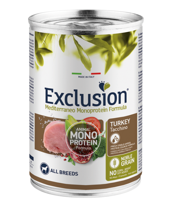 Umido bilanciato per cani adulti Exclusion Mediterraneo, con un'unica fonte di proteine animali e componenti funzionali della dieta mediterranea, privo di frumento, mais e soia, con il 90% di carne.