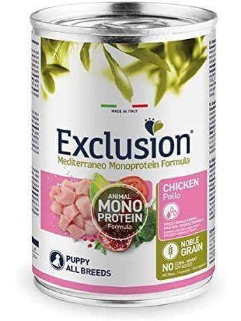 Exclusion Mediterraneo è una linea monoproteica per cani, di qualità super premium, che trae spunto dalla tradizione mediterranea, di cui contiene i migliori ingredienti: olio di oliva, pomodoro, melograno, piselli e cicoria. Utilizza le carni bianche del pollo e il pesce per la loro elevata digeribilità, il granoturco e il riso, entrambe di produzione nazionale, come fonti di carboidrati.